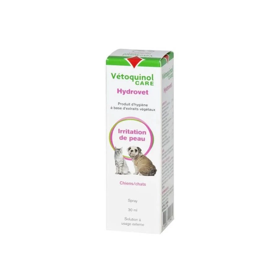 Hydrovet de Vétoquinol Care est un spray doux pour votre chien ou votre chat. Il contient 8 extraits végétaux et des huiles essentielles aux vertus bénéfiques pour la peau de votre compagnon.